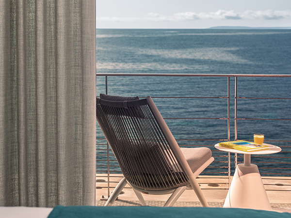 Les 40 chambres et suites, les deux restaurants, dont une table gastronomique raffinée, ainsi que le spa (baigné de lumière naturelle), offrent une vue imprenable sur la Grande Bleue.